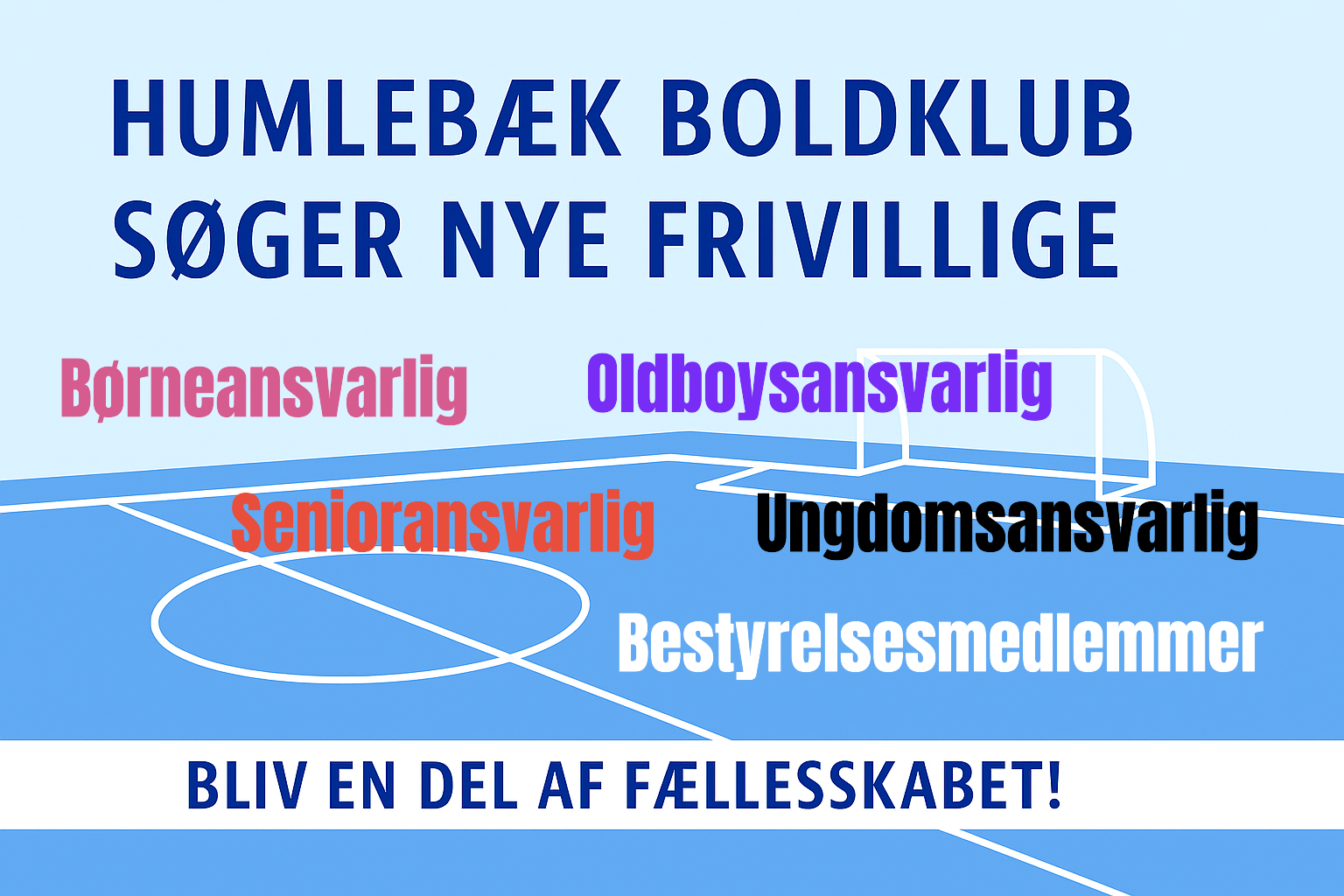 Humlebæk Boldklub søger frivillige, der kan bidrage til foreningens arbejde. Ved kommende generalforsamling den 28. februar 2026 skal der vælges to nye medlemmer til bestyrelsen, og derudover mangler vi sportsansvarlige for de fire aldersgrupper: børn, unge, seniorer og oldboys.